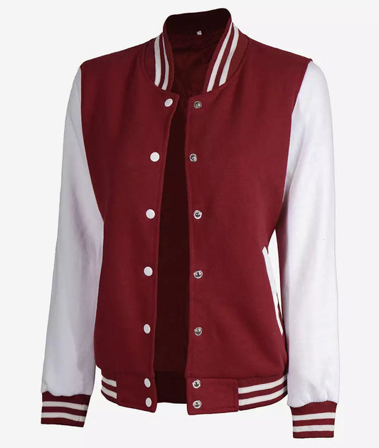 Women's Maroon and White Varsity Jacket - Baseball Style