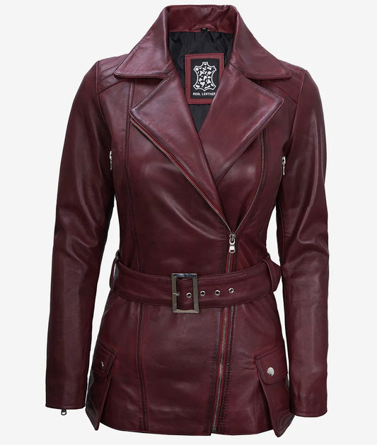 Women's Maroon Asymmetrical Moto Leather Belted Jacket