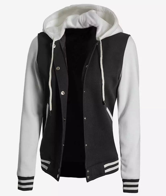Women's White and Black Hooded Varsity Jacket - Letterman Style