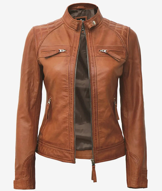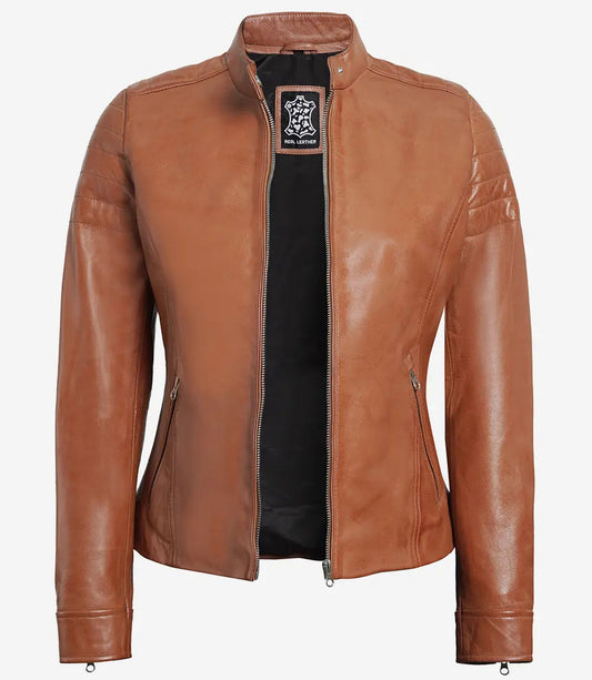 Women's Slim Fit Tan Brown Waxed Biker Leather Jacket