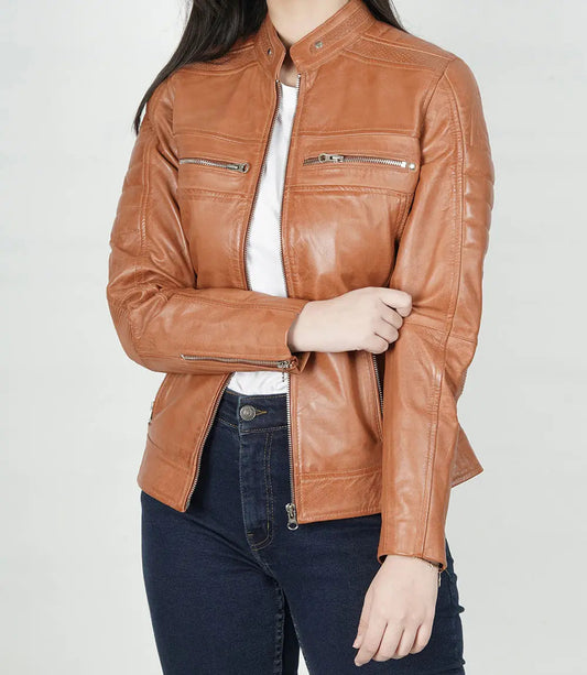 Women's Tan Real Lambskin Leather Quilted Biker Jacket