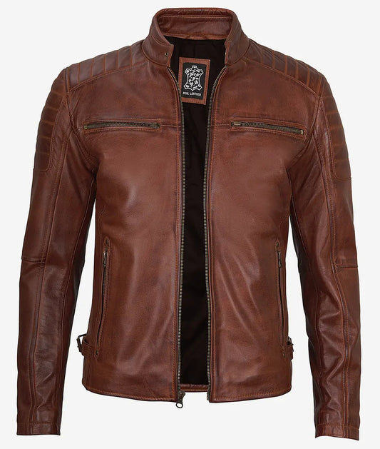 Men's Waxed Cognac Cafe Racer Real Leather Jacket