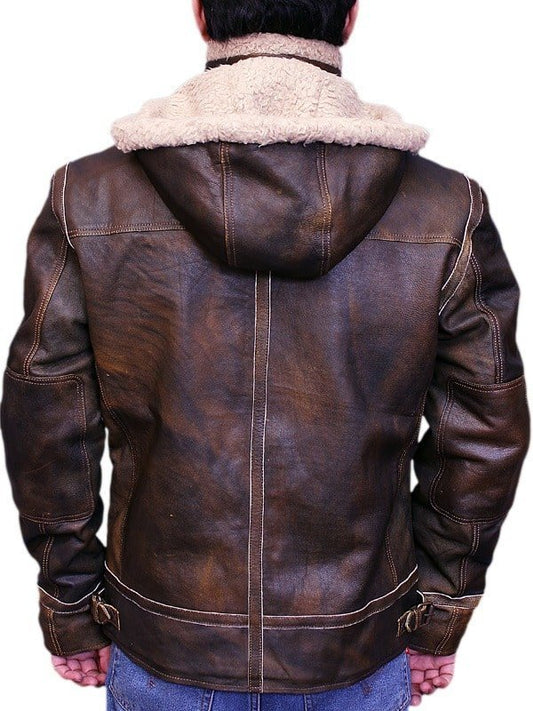 Men Aviator Leather Bomber Jacket with Fur Hood Brown