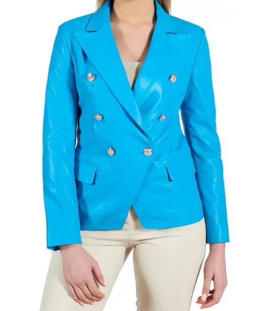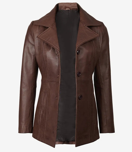 Women's Cognac Button Down 3/4 Length Leather Coat