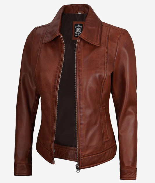 Women's Cognac Real Leather Slim Fit Biker Jacket