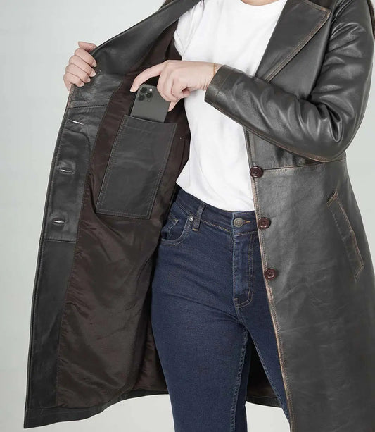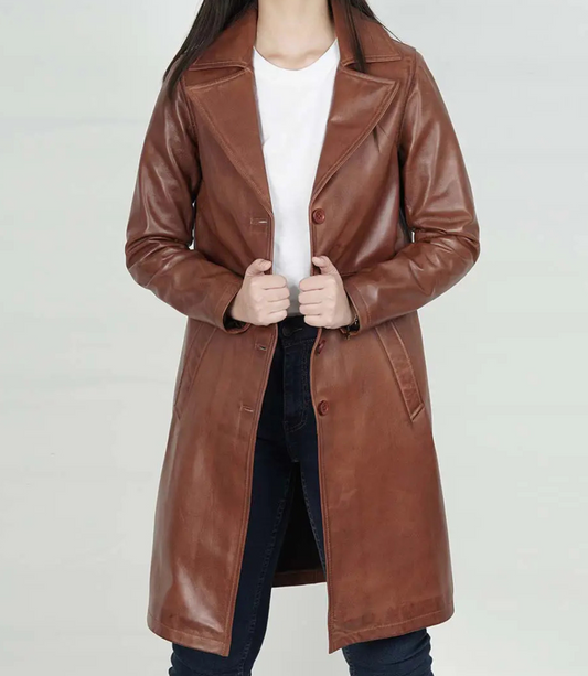 Vendor:Jacket-HitWomen's Cognac Long Leather Car Coat