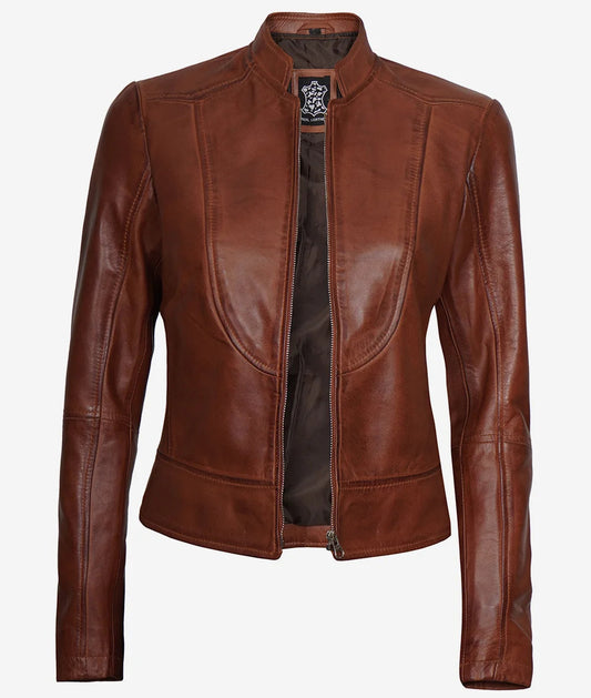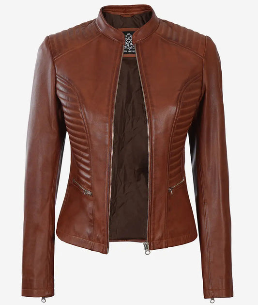 Women's Cognac Cafe Racer Leather Jacket | Quilted Shoulder