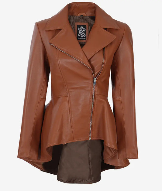 Women's Cognac Asymmetrical Peplum Leather Jacket