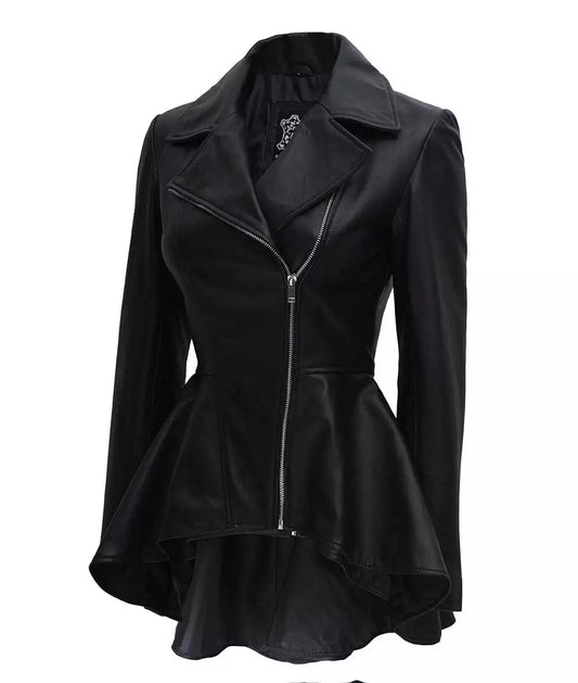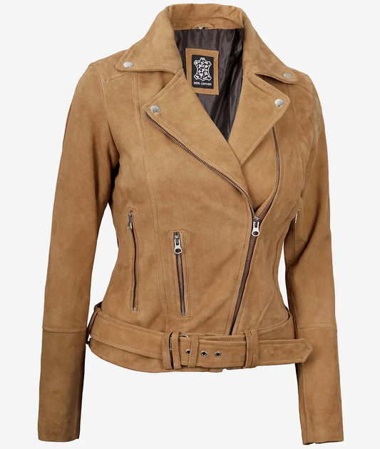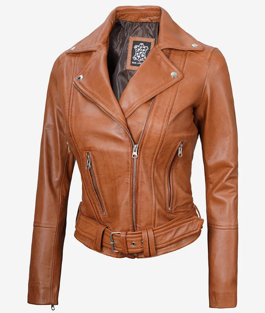 Women's Cognac Asymmetrical Leather Jacket Belted Waist