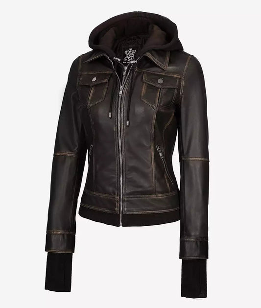 Women's Brown Rub-Off Detachable Hooded Bomber Leather Jacket