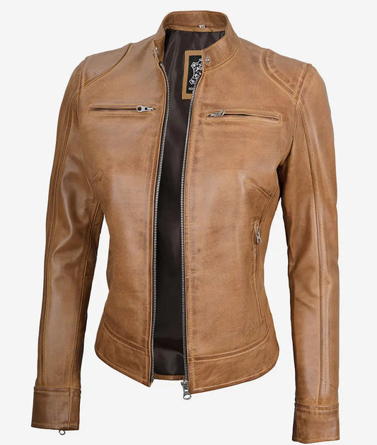 Women's Cognac Asymmetrical Leather Moto Jacket