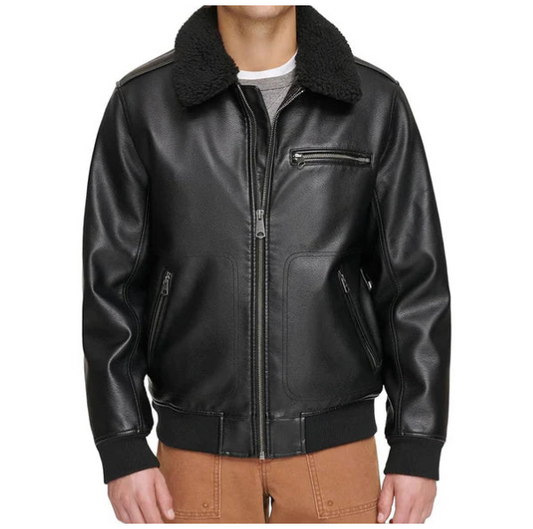 Men's Sherpa Collar Faux Shearling Bomber Leather Jacket