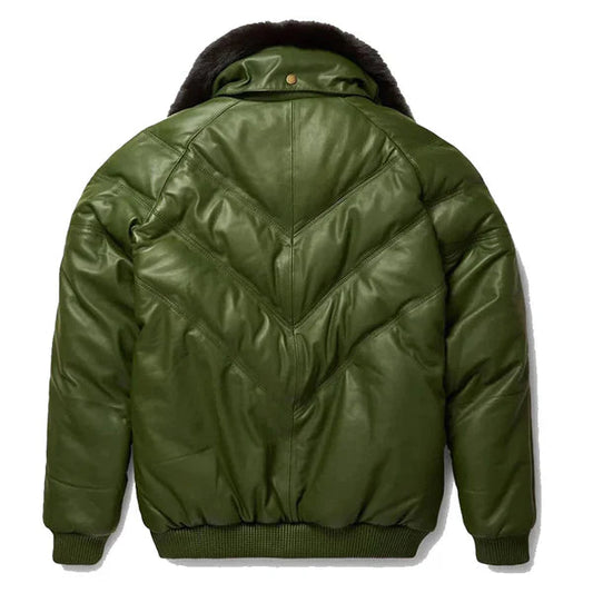 Men's V-Bomber Faux Shearling Green Leather Jacket