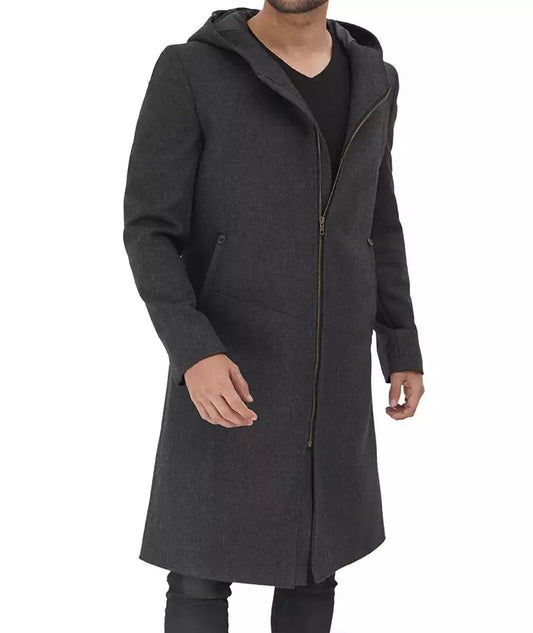 Men's Gray Long Wool Overcoat with Hood