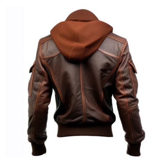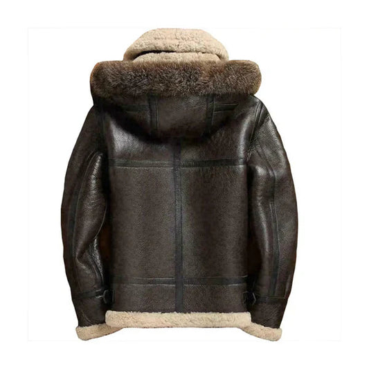 Men's Flight Lapel Hooded Faux Shearling Brown Leather Jacket