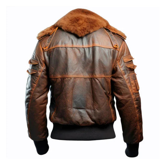 Men's Fur Collar Cognac Leather Bomber Jacket