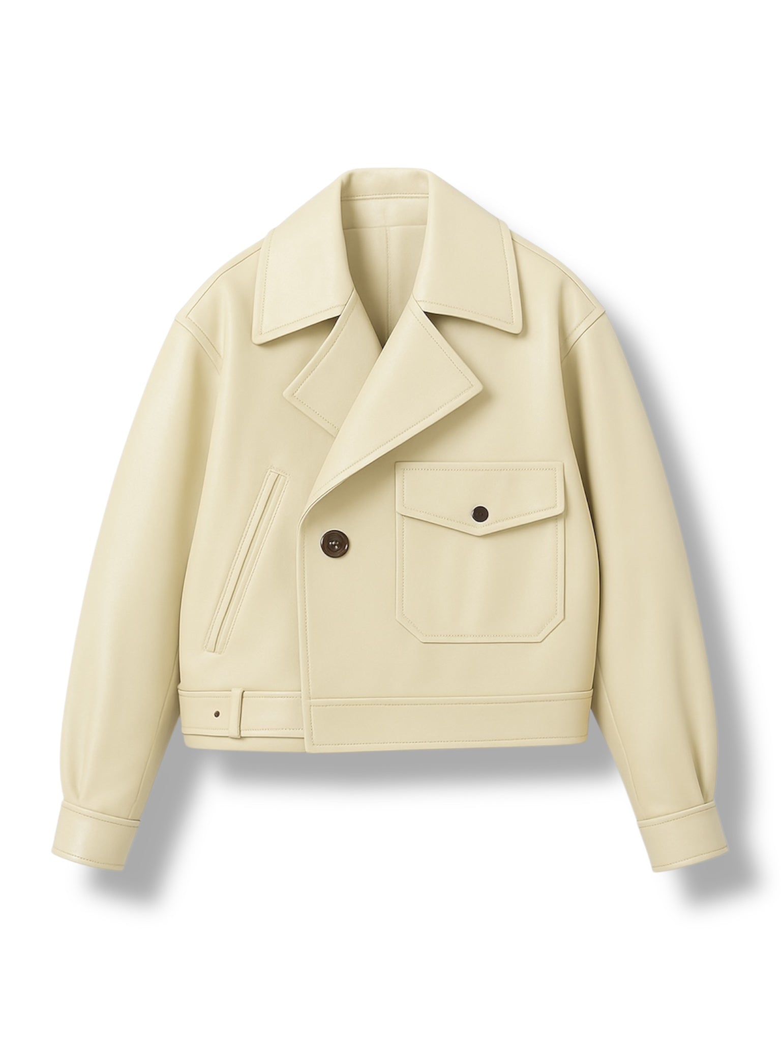IVORY - Biker Top-Grain Cowhide Leather Jacket. Made from authentic Cowhide leather, this jacket combines durability and luxury. The trendy lapel collar and double-breasted belt closure contribute to its high-street cafe racer aesthetic. Featuring an oversized loose design, this jacket promises comfort and freedom of movement. A handy utility pocket adds practicality to the mix. This jacket is more than just a clothing item – it's a fashion statement perfect for the modern, fashionable woman.